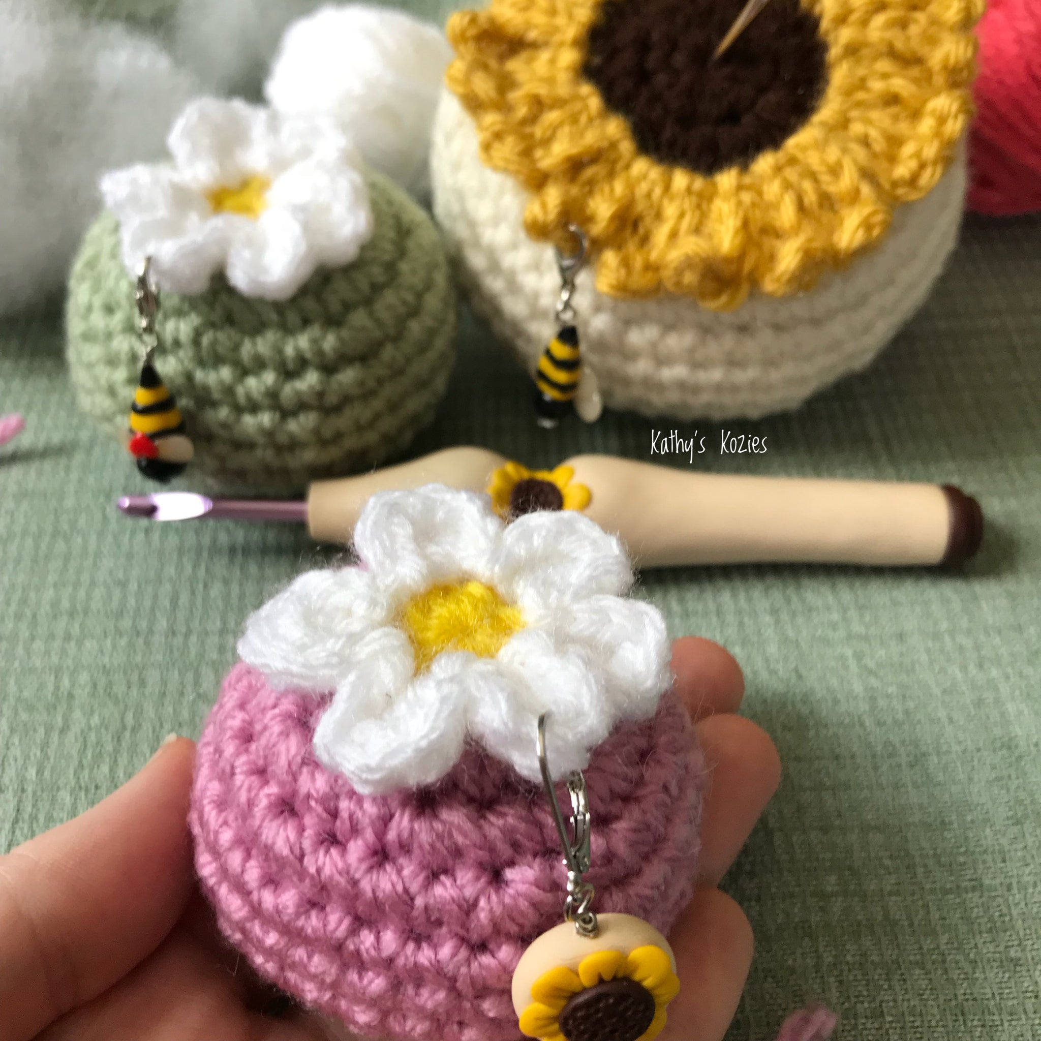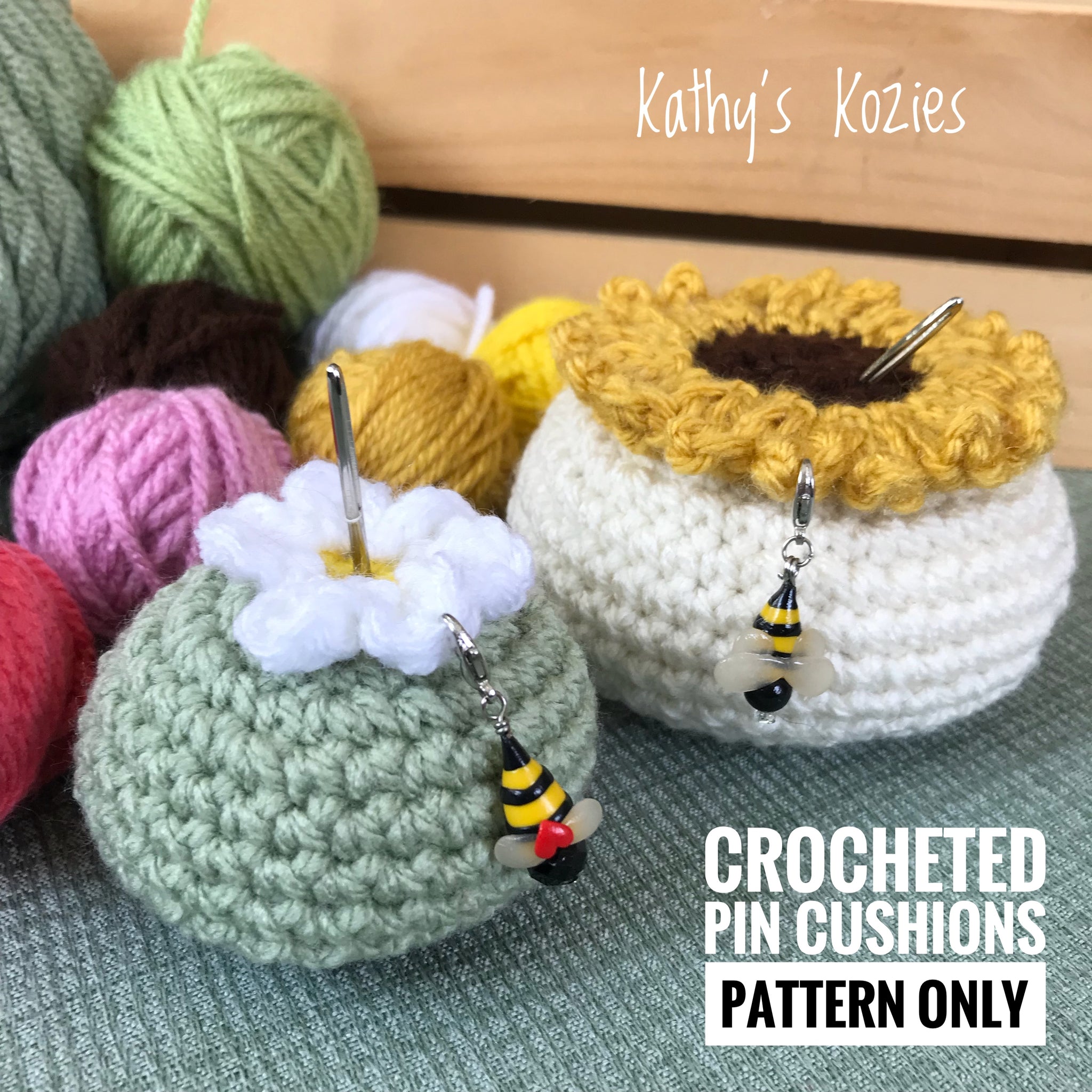 These little pin cushions are a great stash buster! The smaller ones appeal to anyone who uses pincushions  while the larger Sunflower one is great for us Crochers who love their stitch markers!  I specifically designed these to be able to hold both pins and stitch markers